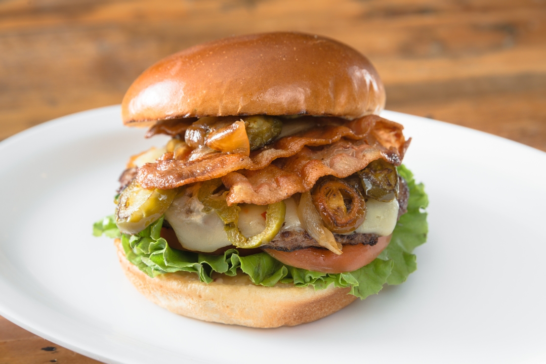 1/4 lb. of fresh Angus beef patty, 2 strips of bacon, pickled jalapenos, caramelized onions, pepper jack cheese, lettuce, tomato, and house Sauce with spread of cream cheese on brioche bun.