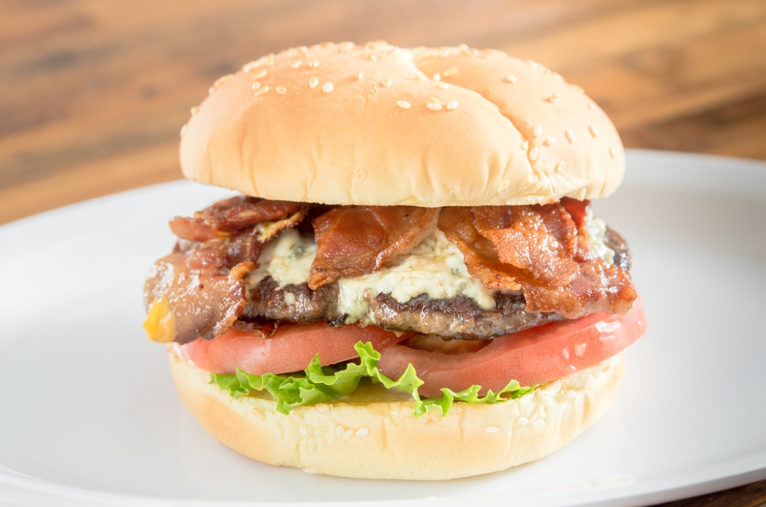 1/4 lb. Beef Patty, 3 strips of bacon, crumbled blue cheese, lettuce, tomato, onion, pickle and house Sauce on a Sesame Bun.