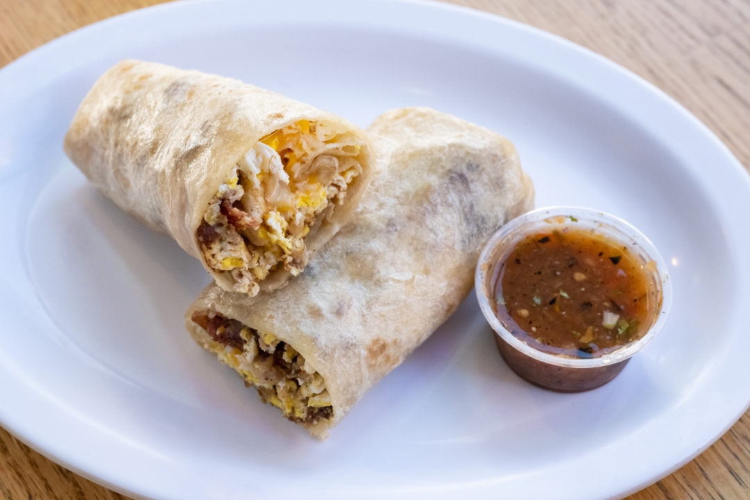 your choice of bacon or sausage, scrambled egg, cheese mix with house salsa on side.