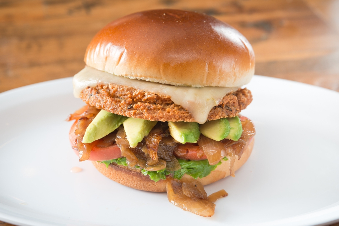 Homemade veggie patty, pepper jack cheese, fresh avocado, caramelized onions, lettuce tomatoes, pickles and house sauce on brioche bun.