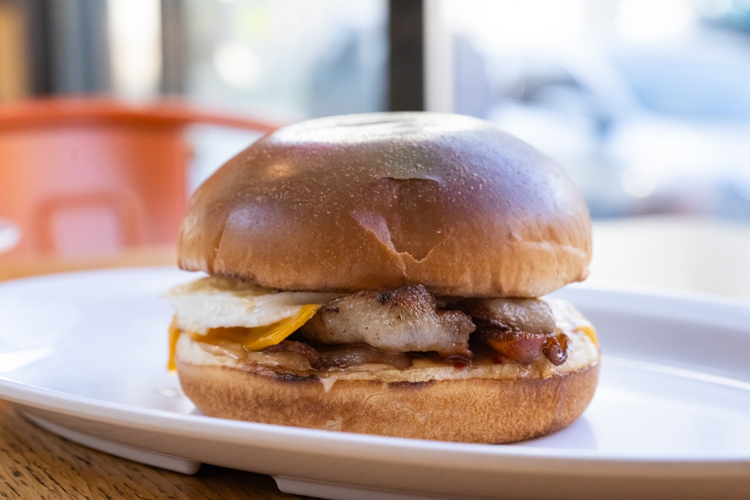 2 bacons, fried egg and american cheese on a brioche bun.