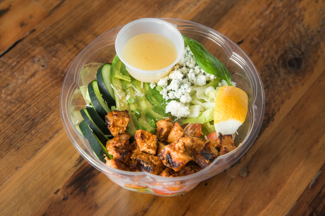 chopped masala chicken, Chopped romaine lettuce, spinach, fresh avocado, english cucumber, grape tomatoes, onions, crumbled blue cheese, with your choice of dressing. (ranch, blue cheese, balsamic vinaigrette and italian)