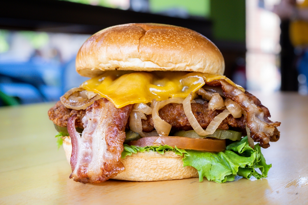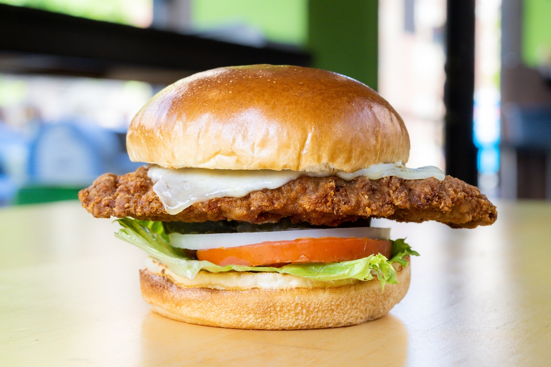 6 Oz of deep fried Zesty chicken breast, pepper jack cheese, lettuce, tomatoes, onions, pickles and house sauce on brioche bun.