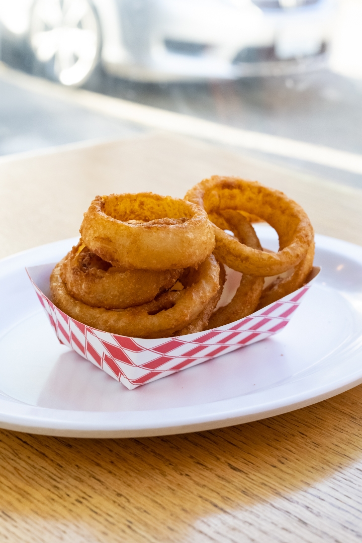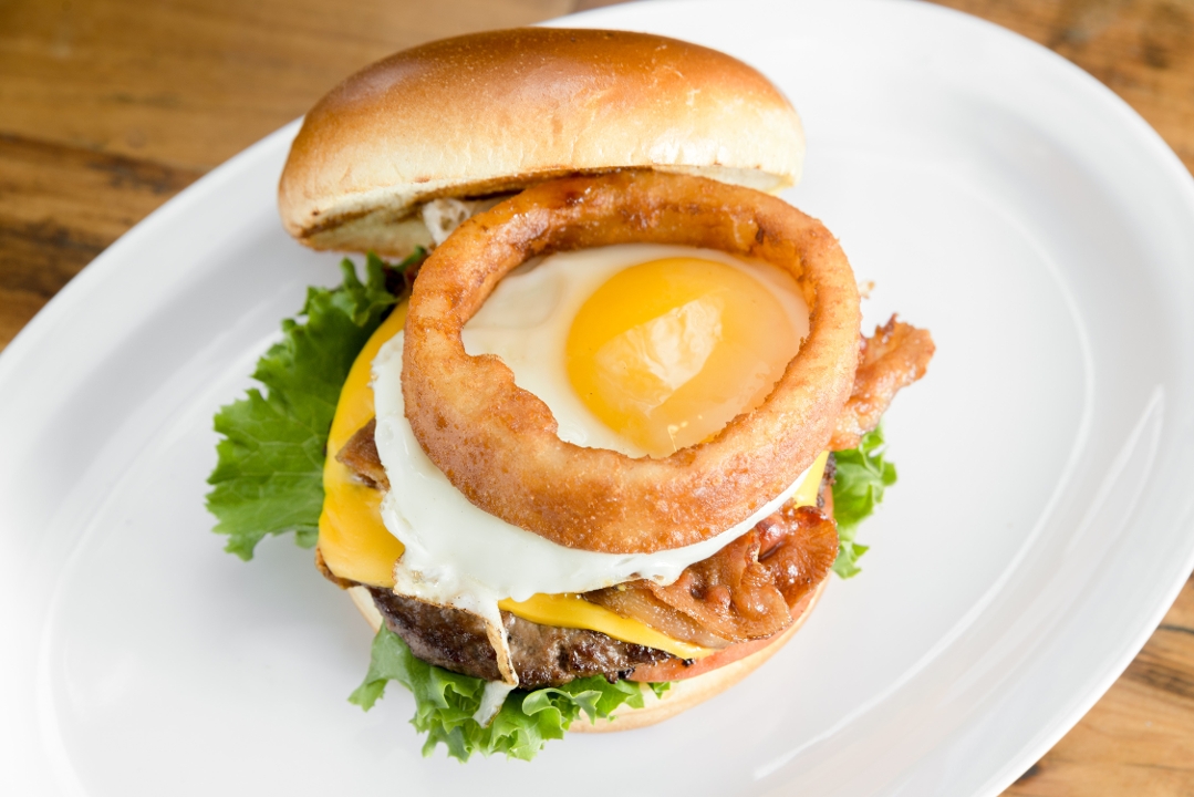 1/4 lb. of fresh Angus beef patty, 2 strips of bacon, fried egg, american cheese topped w/ onion ring, lettuce, tomato, pickle and house Sauce on a brioche bun.