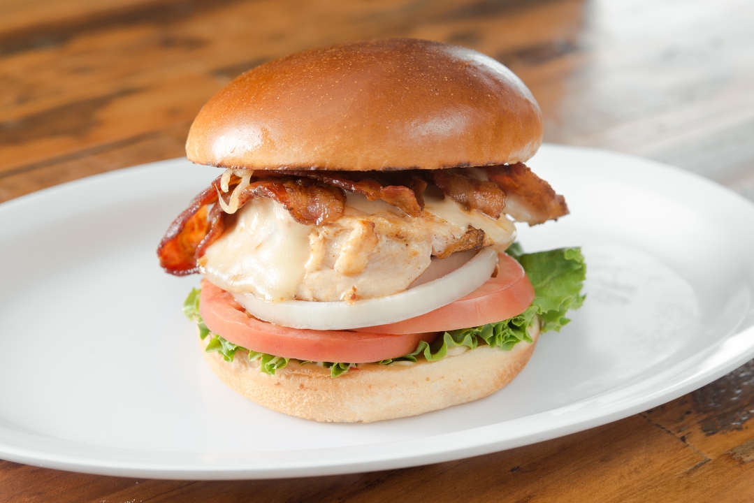 5 oz of grilled chicken breast, 2 strips of bacon, swiss cheese, lettuce, tomatoes, onions, pickles and house sauce on a brioche bun.