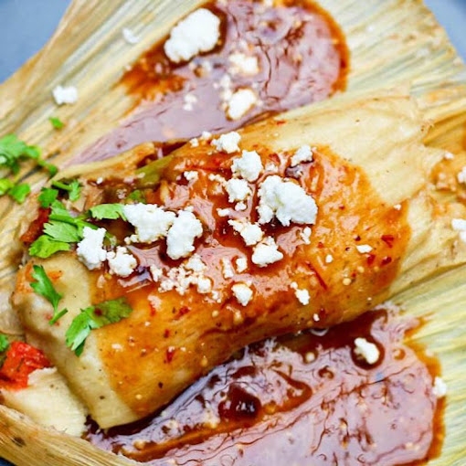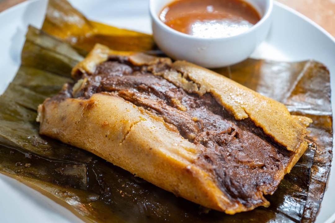 An Oaxacan-style banana leaf tamale with your choice of meat (herb chicken with mole sauce or diced pork with salsa verde or vegetarian option.