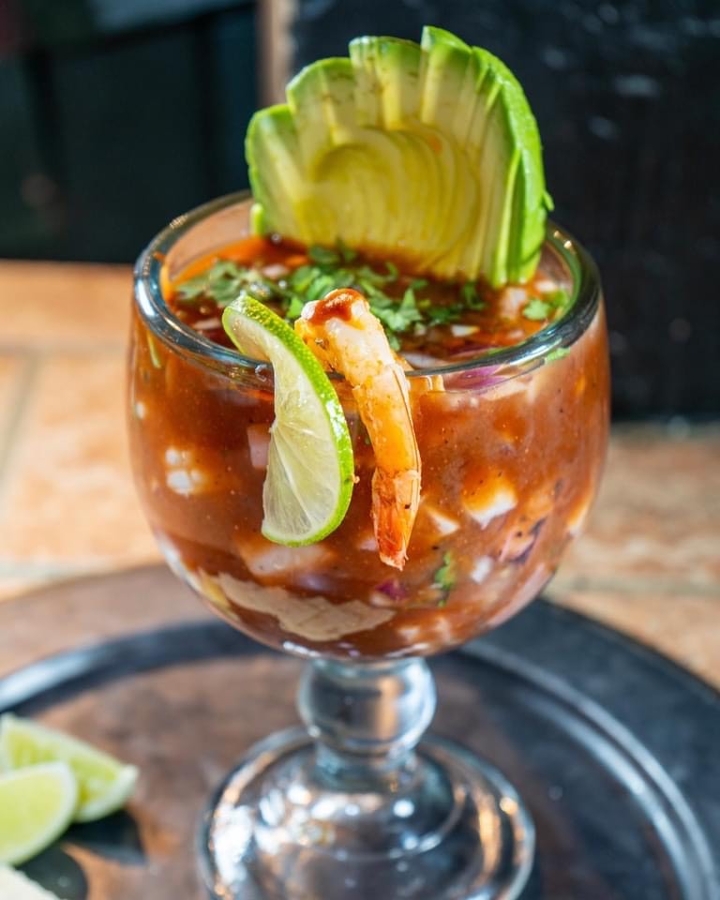 Plum shrimp in our homemade cocktail sauce served over a layer of fresh avocado and crackers.