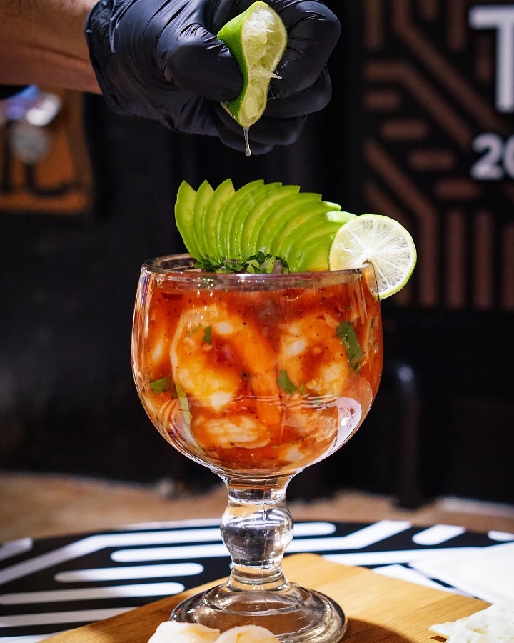 Plum shrimp and Octopus in our homemade cocktail sauce served over a layer of fresh avocado and crackers.