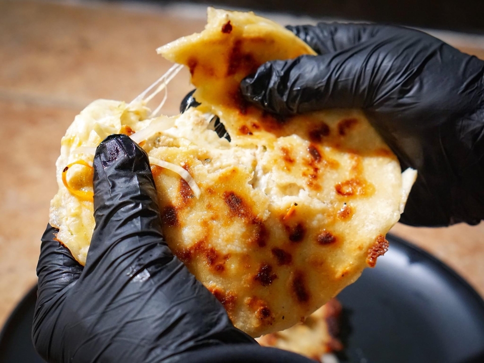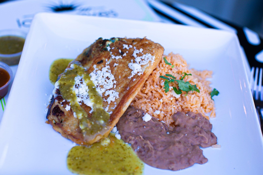 Stuffed corn-flour tortilla grilled up like pancake served with queso fresco and topped with slaw. Meat options: Chicharron (crunchy pork) with cheese or bean and cheese.