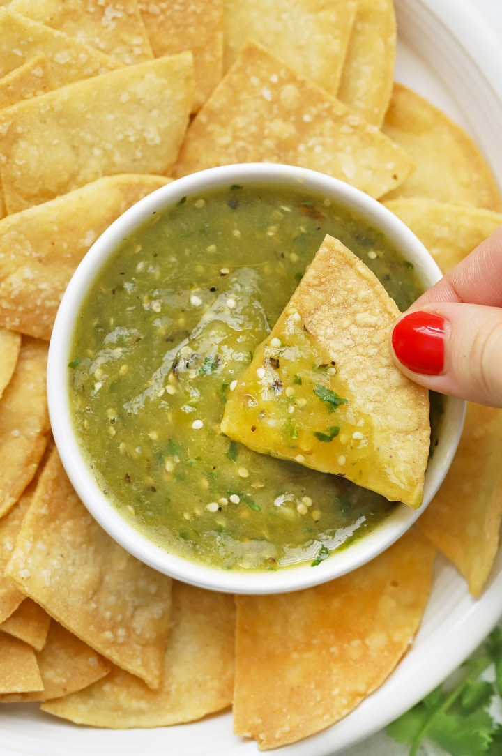 Corn tortilla, covered with green sauce, cilantro, onions, sour cream, cheese, eggs, and meat of choice.