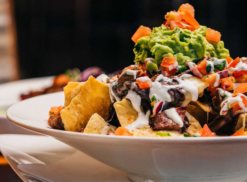 Meat, lettuce, pico de gallo, corn, guacamole, and sour cream. Meat of choice.