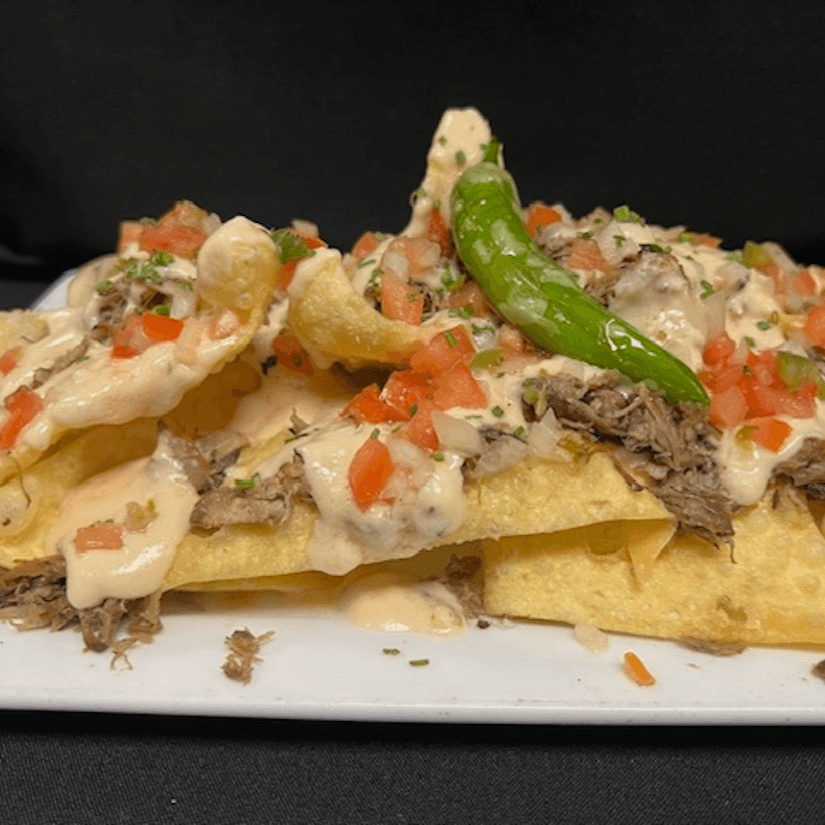Crispy fried wonton chips topped with tender kalua pork, and creamy cheese sauce. A delicious twist on nachos.