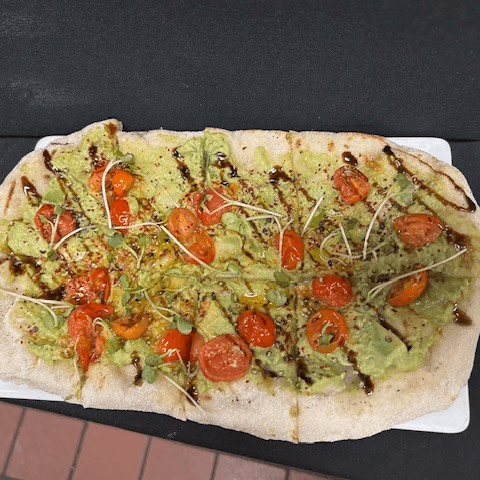 Fresh Avocado on Pinza bread, charred grape tomatoes, cracked pepper, drizzle of olive oil, micro greens.