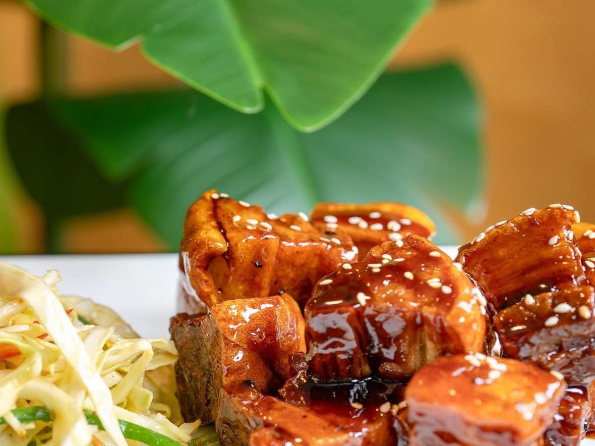 Bone-In Wingettes braised in Garlic Soy, Onion, Vinegar Sauce, (& hint of Anato Seasoning). Served on a bed of White Sticky Rice.