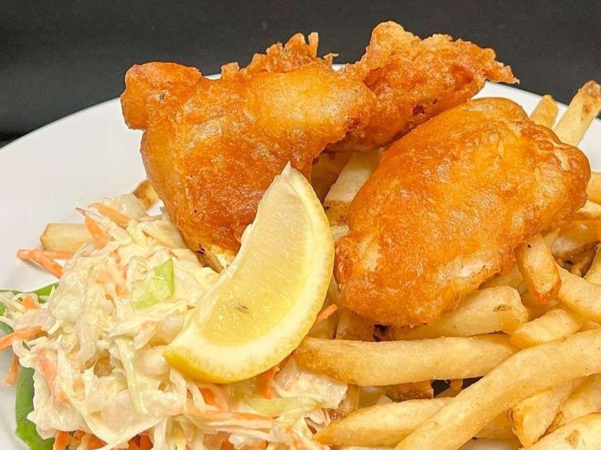 Beer battered cod served with fries, coleslaw, and tartar sauce.