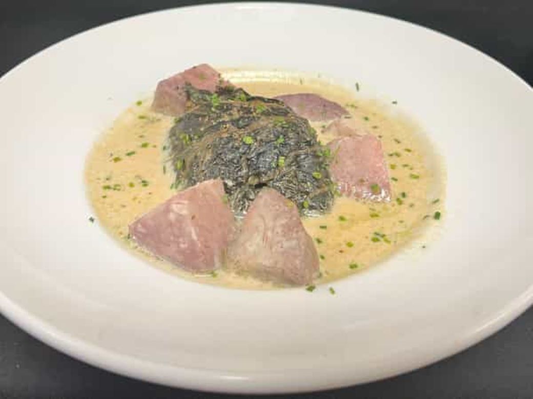 Roasted eggplant mixed with spinach and seasoned in a zesty coconut cream. Served with garlic toast.