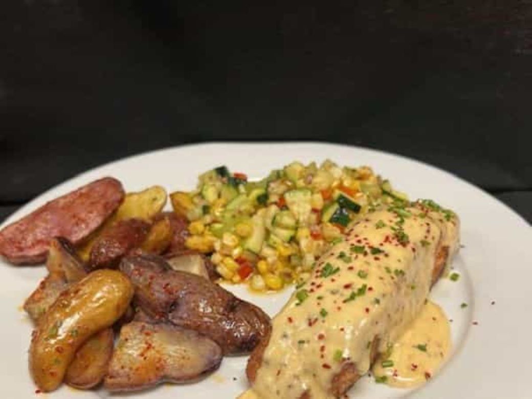 A 6 oz. salmon fillet drizzled with rich yuzu cream sauce, served alongside seasoned flour dusted fried potatoes and vibrant succotash.