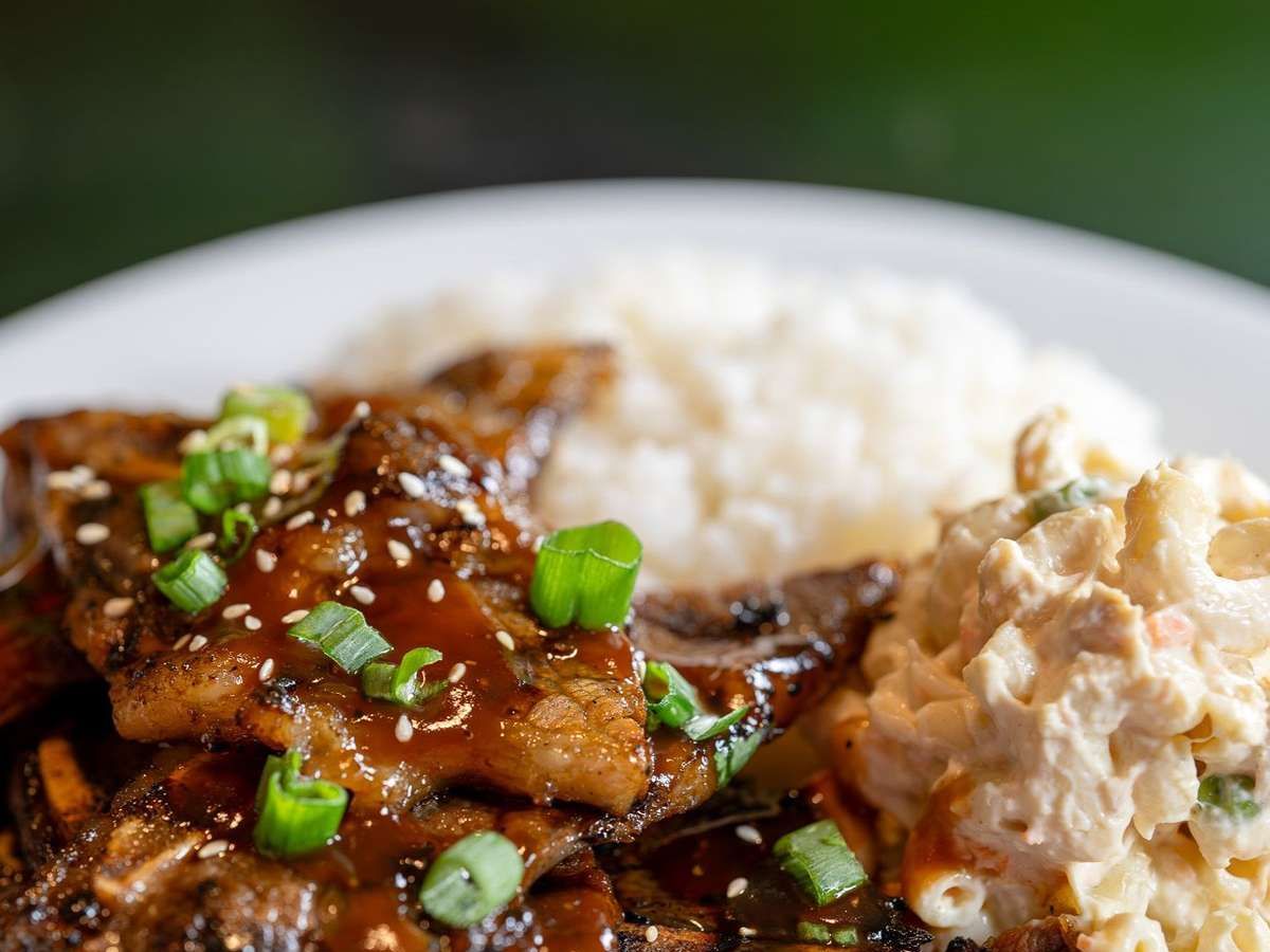 Sweet marinated short ribs grilled to perfection, served with sticky white rice, tuna mac salad.