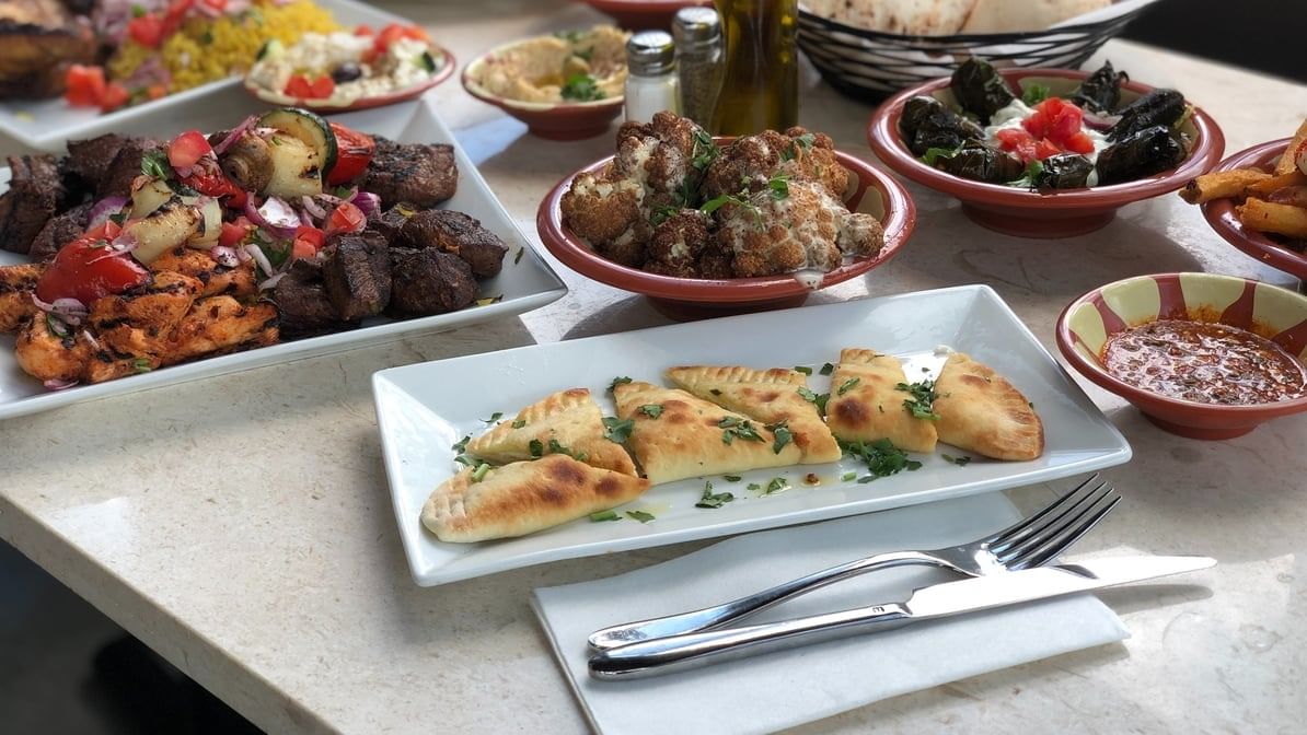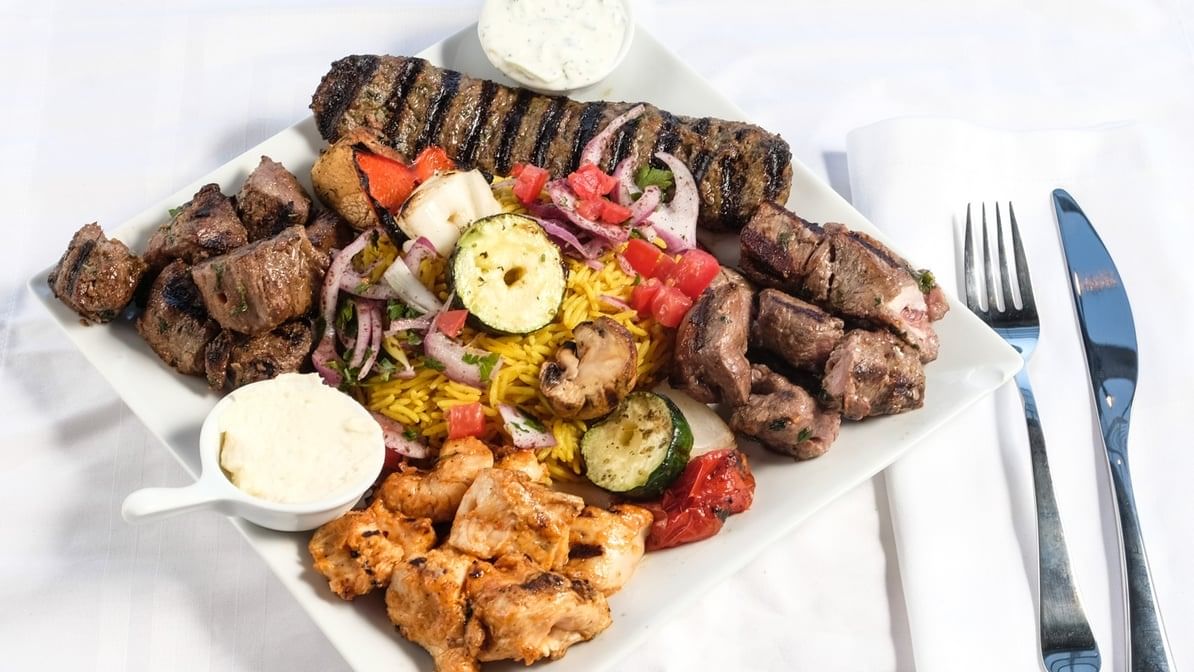 Gluten free. Beef, lamb, chicken, kafta & vegetable kabob, toum, tzatziki, three vegetarian mezze items & your choice of rice