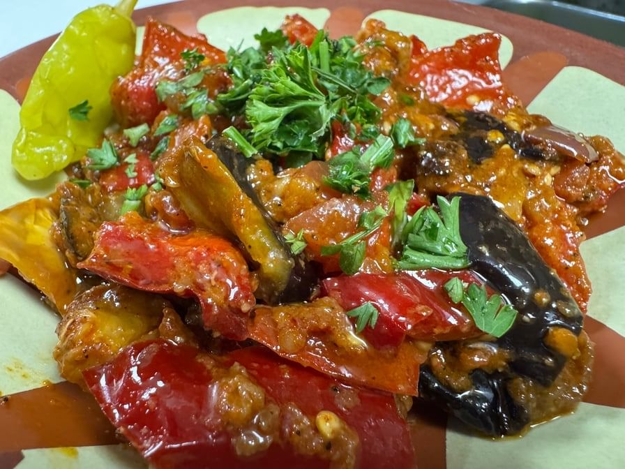 Eggplant, red peppers, tomatoes, garlic, and spices, topped with parsley and olive oil. Served cold