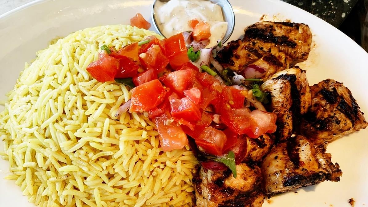 Gluten free. Grilled boneless & skinless chicken breast with tomatoes, onions, parsley, tzatziki, your choice of rice & one side order (includes 1 pita)