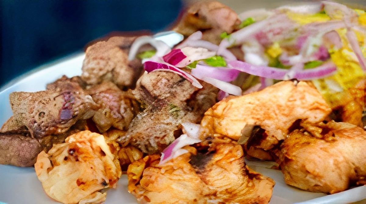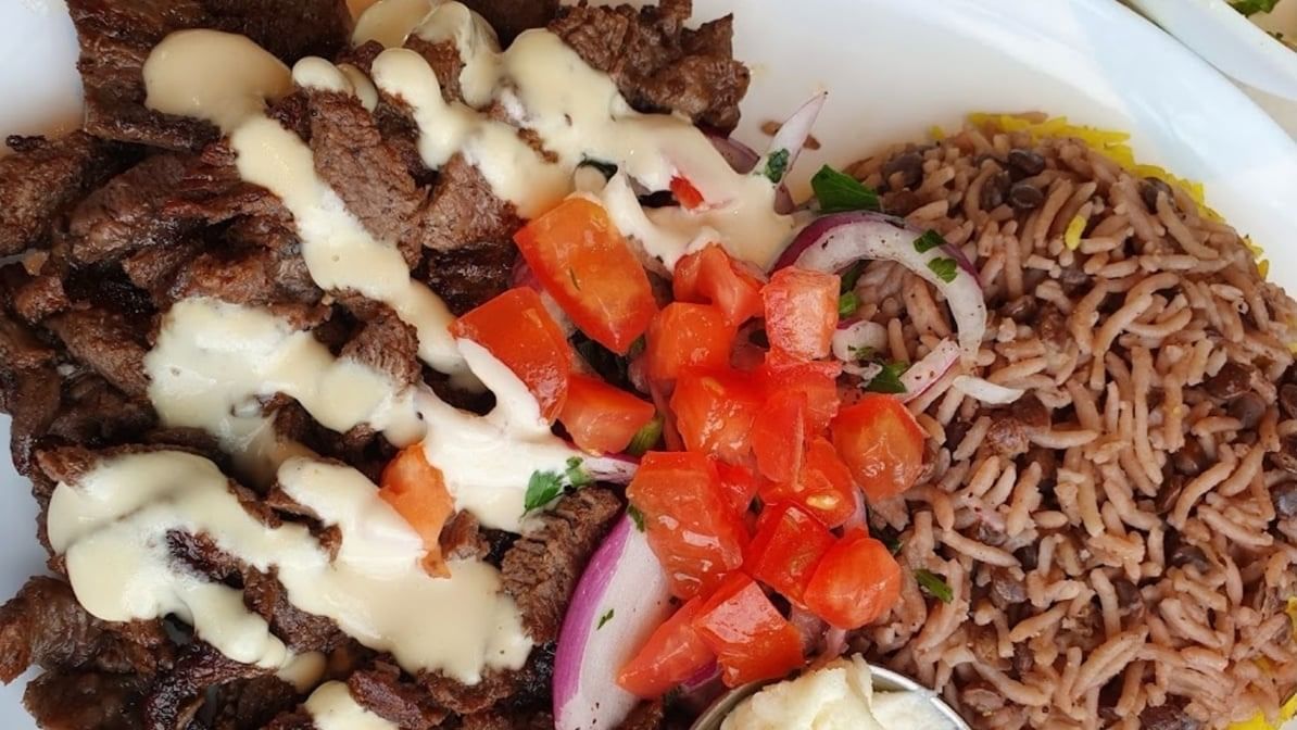 Authentic beef & lamb shawarma with tomatoes, onions, parsley, tahini, toum, your choice of rice & one side order (includes 1 pita). Gluten free available