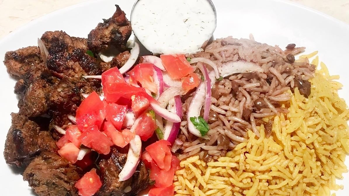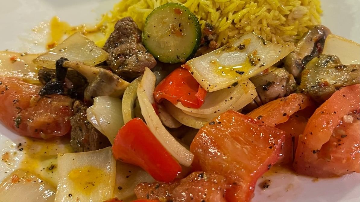 Grilled lamb kabob, mushroom, bell pepper, tomato, onion, zucchini, caramelized onions, tzatziki, your choice of rice & side order