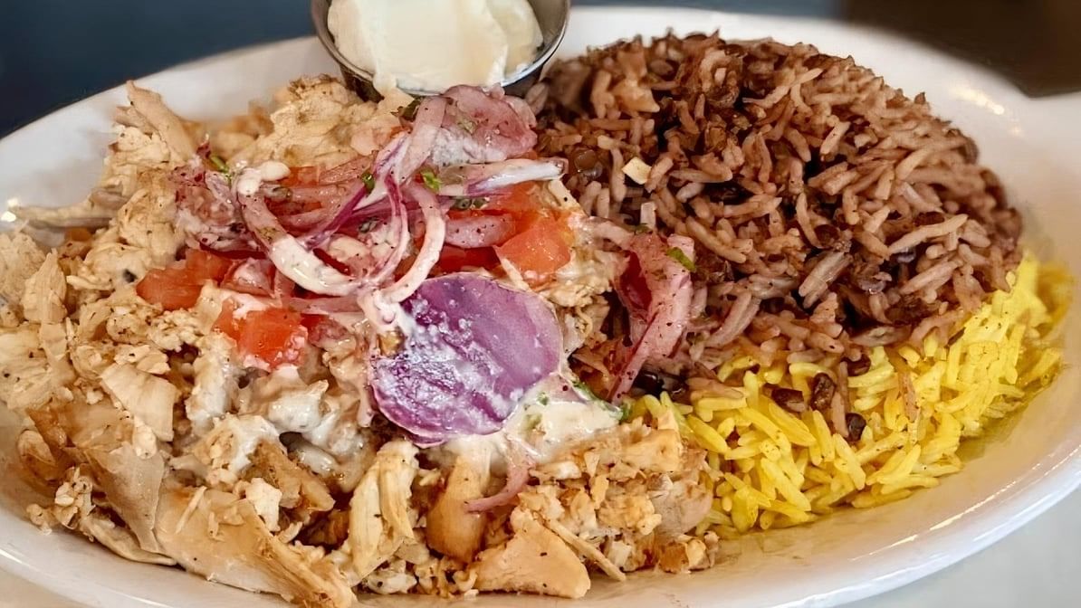 Chicken + beef & lamb shawarma with tomatoes, onions, parsley, tahini, toum, your choice of rice & one side order (includes 1 pita). Gluten free available
