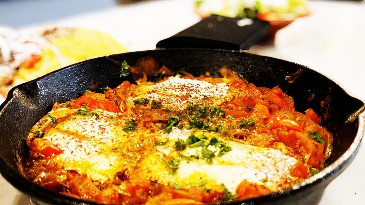 Vegetarian. Gluten free. Three eggs cooked with tomato, red bell pepper, onion, garlic, herbs, olive oil and spices, served in a cast iron skillet (includes 2 pita)