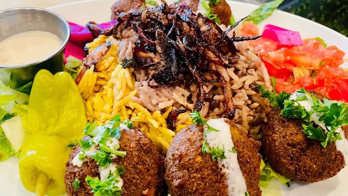 Vegan. Gluten free. Falafel patties, parsley, pickled turnip, pepperoncini, tahini, your choice of rice & one side order (includes 1 pita)