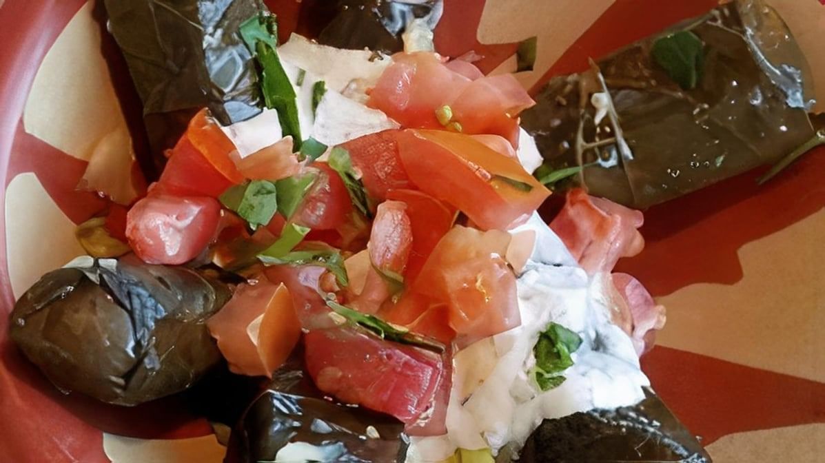 Vegetarian. Gluten free. Grape leaves stuffed with rice and spices, soaked in olive oil & lemon juice & topped with tzatziki sauce