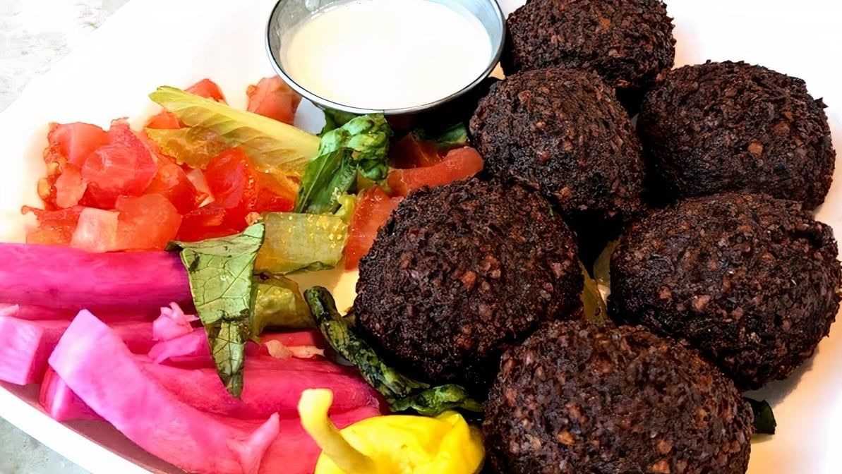 Vegan. Gluten free. Veggie patties made with chickpeas, fava beans, herbs & spices, served with pickled turnips & taratoor