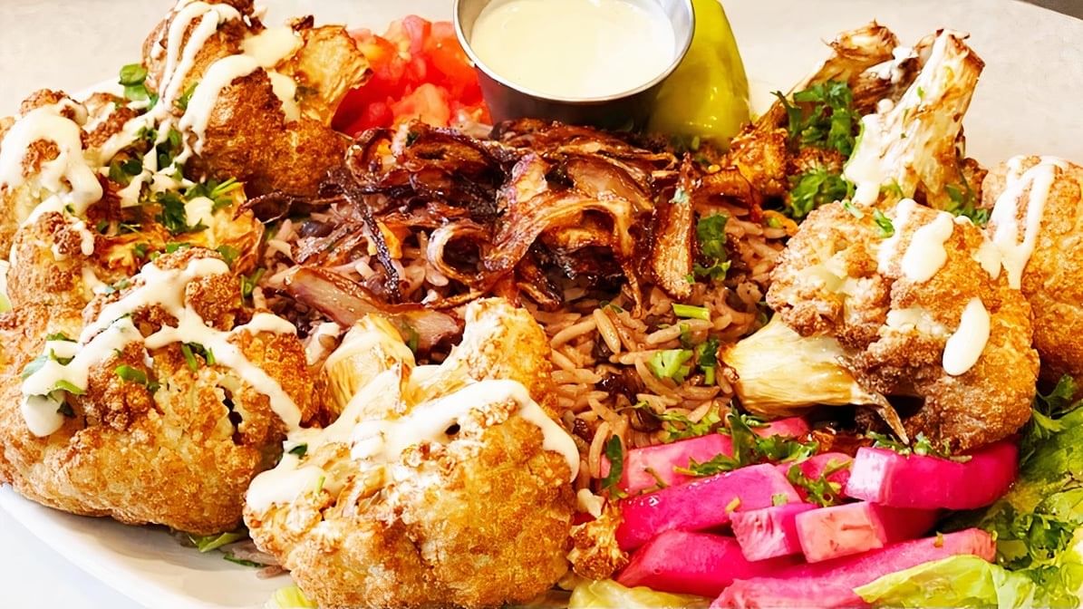 Vegan. Gluten free. Flash-fried cauliflower, parsley, pickled turnip, pepperoncini, caramelized onions, tahini, your choice of rice & side order