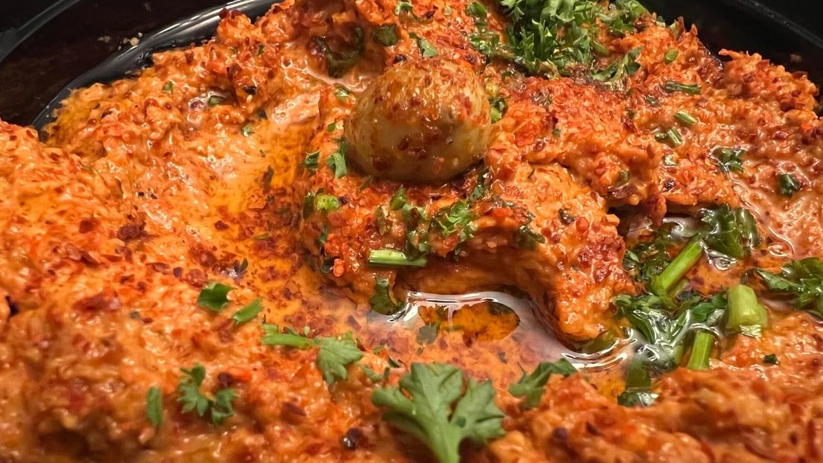 Red pepper, walnut, pita chips, pomegranate molasses, parsley, spices & olive oil