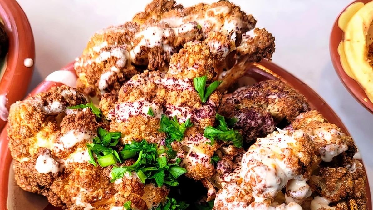 Vegan. Gluten free. Flash-fried cauliflower with spices, parsley & tahini