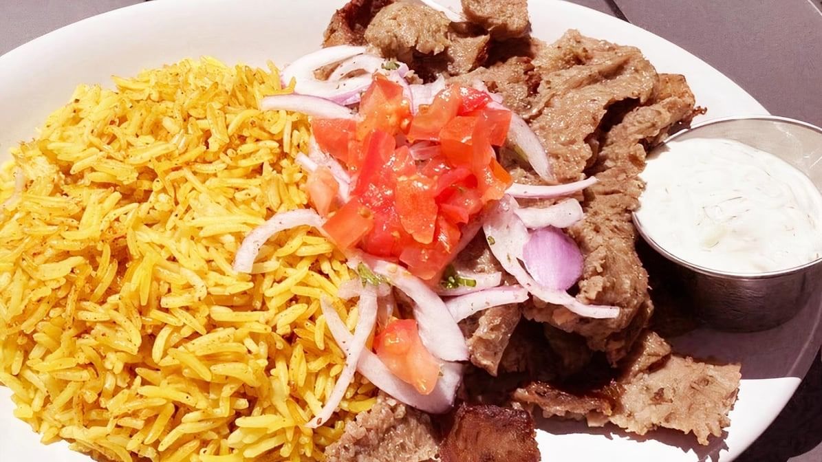 Gyro meat with tomatoes, onions, tzatziki, your choice of rice & one side order (includes 1 pita)