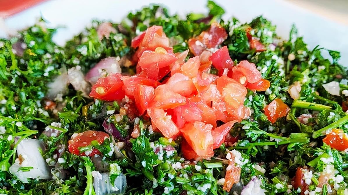 Vegan. Gluten free. Classic Lebanese salad of chopped parsley with quinoa, tomatoes, onions & spices in a lemon & olive oil dressing