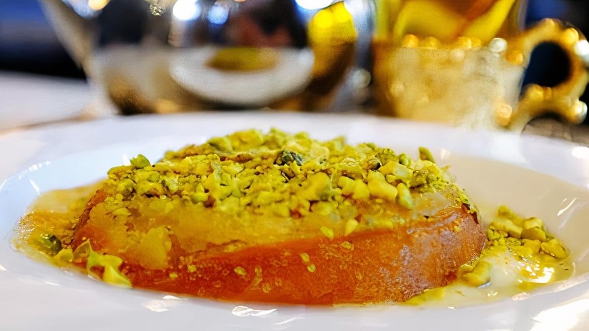 Vegetarian. Melted cheese pastry made the authentic Lebanese way with a buttery crust, soaked in orange blossom syrup and topped with pistachios