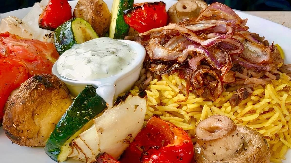 Vegetarian. Grilled mushroom, bell pepper, tomato, onion, zucchini, tzatziki, your choice of rice & one side order (includes 1 pita). Gluten free available
