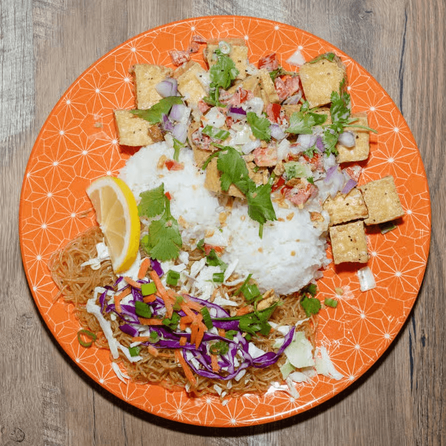 Fried then grilled tofu marinated in our house made garlic aioli, fresh onions, bell peppers. comes with rice and pancit.