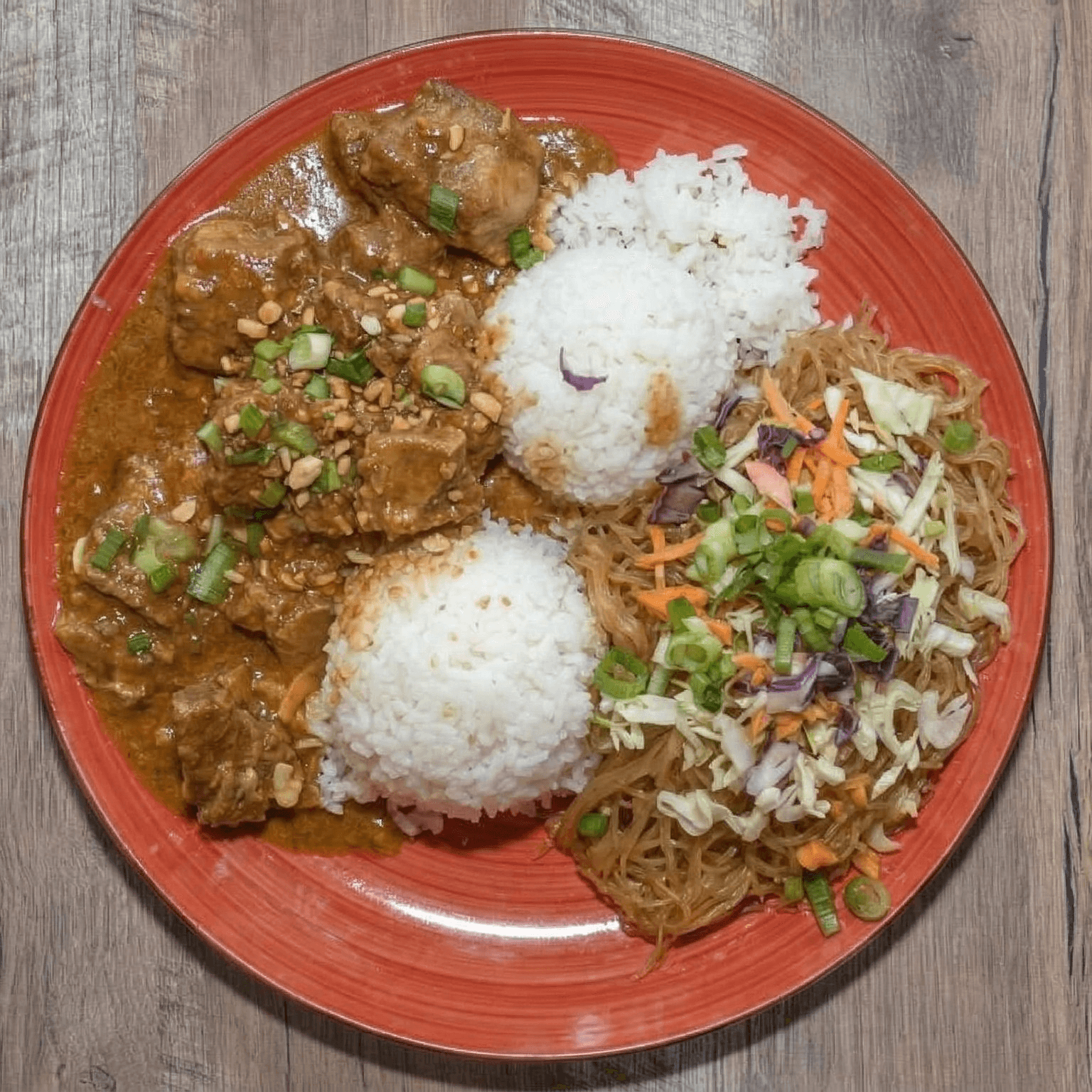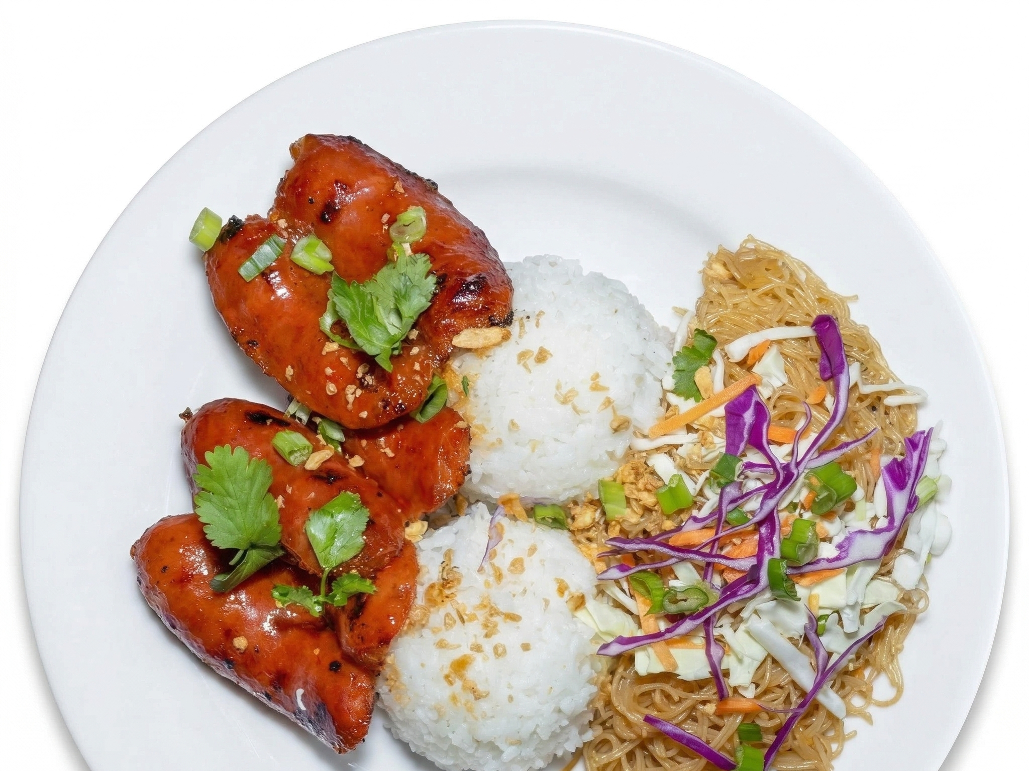 Boneless chicken thigh marinated in soy sauce, vinegar, bay leaf, garlic, and pepper. comes with rice & pancit