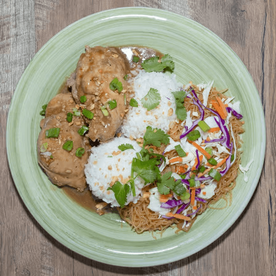 (6) turkey lumpias, with steamed white rice, and pancit.