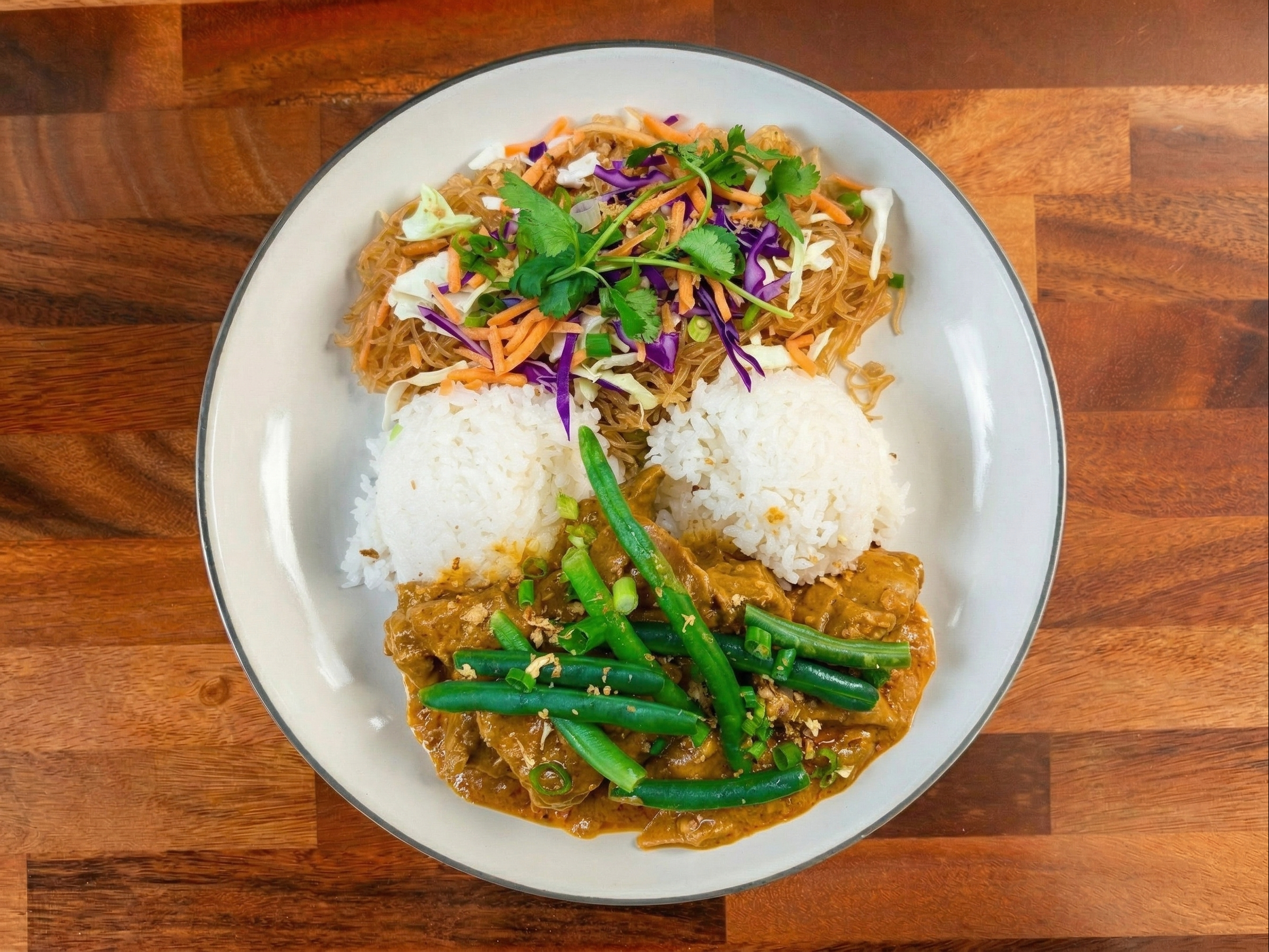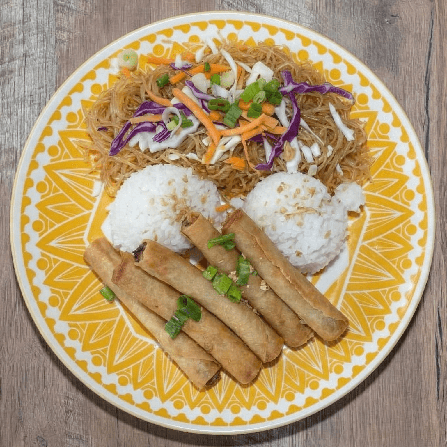Pansit, 6 pcs lumpia (pork, turkey, or beef) with rice