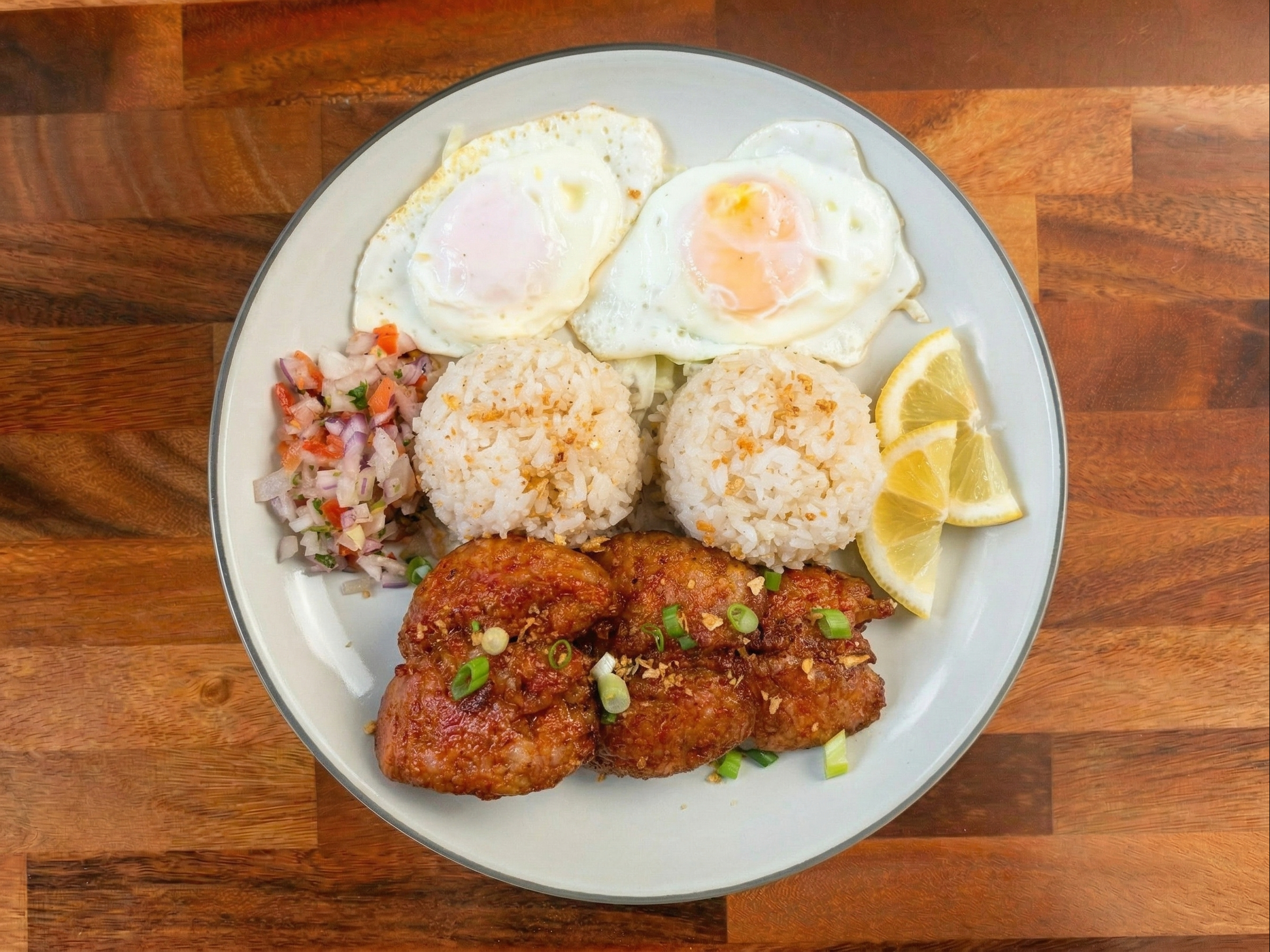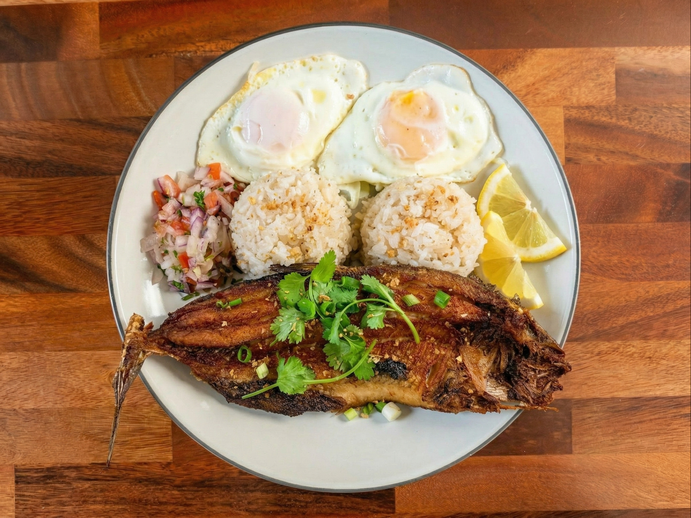Marinated boneless milkfish, fried until golden and crispy. served with garlic rice and two eggs