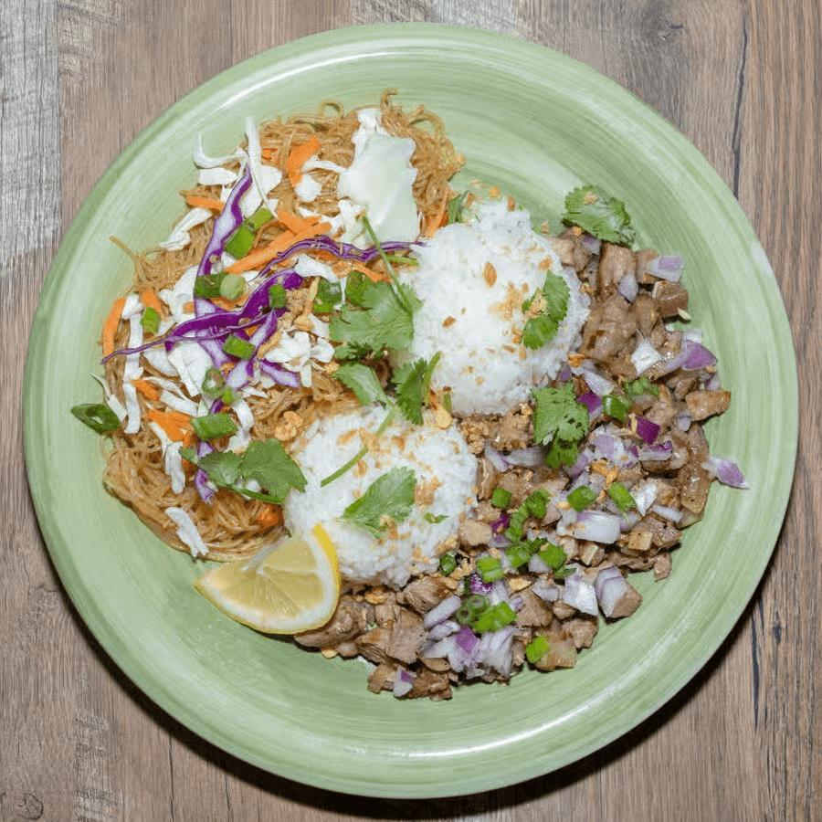 Fried pork belly, house special garlic aioli, onions, and bell peppers. comes with rice and pancit.