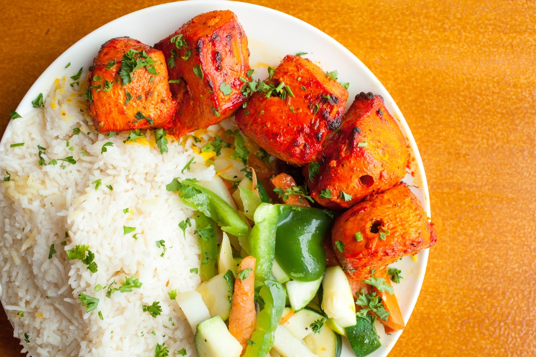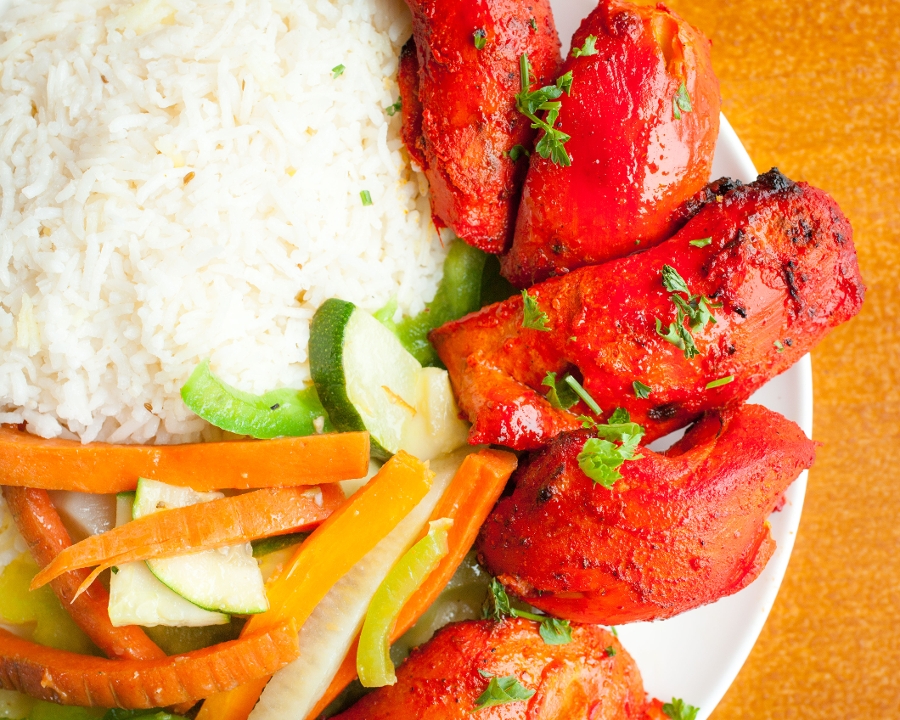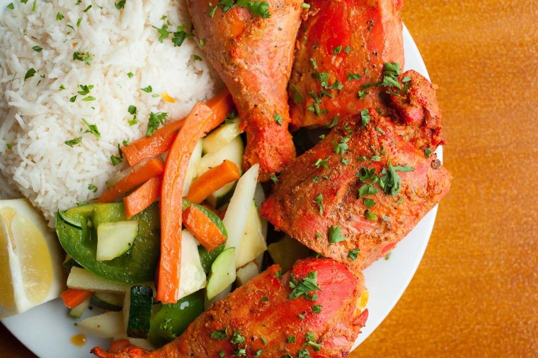 Juicy spring chicken marinated in flavorful, mildly fresh ground spices. Served with basmati rice, fresh sauteed vegetables, and famous cilantro and tamarind chutneys.