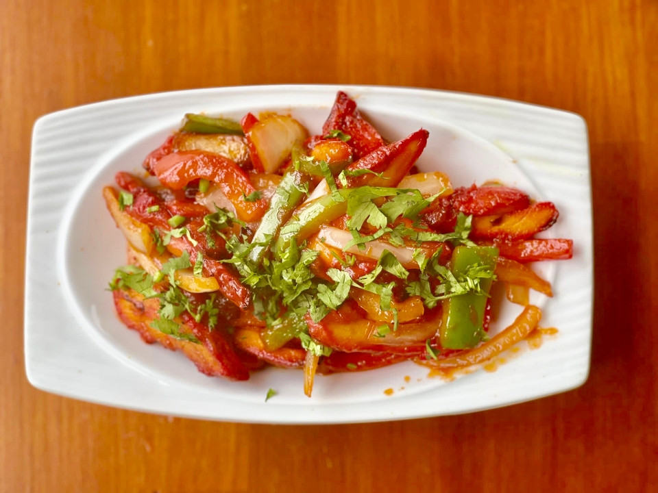 Boneless meat or vegetables stir-fried in brown curry with bell peppers, garlic, ginger, tomatoes, and onions.