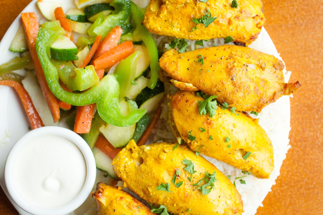 Delicious chicken marinated in garlic, oregano, saffron, and other Middle Eastern spices. Served on a bed of rice and fresh vegetables.