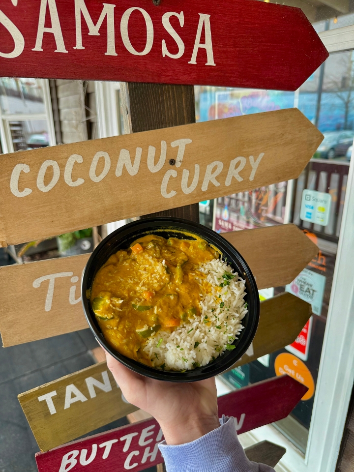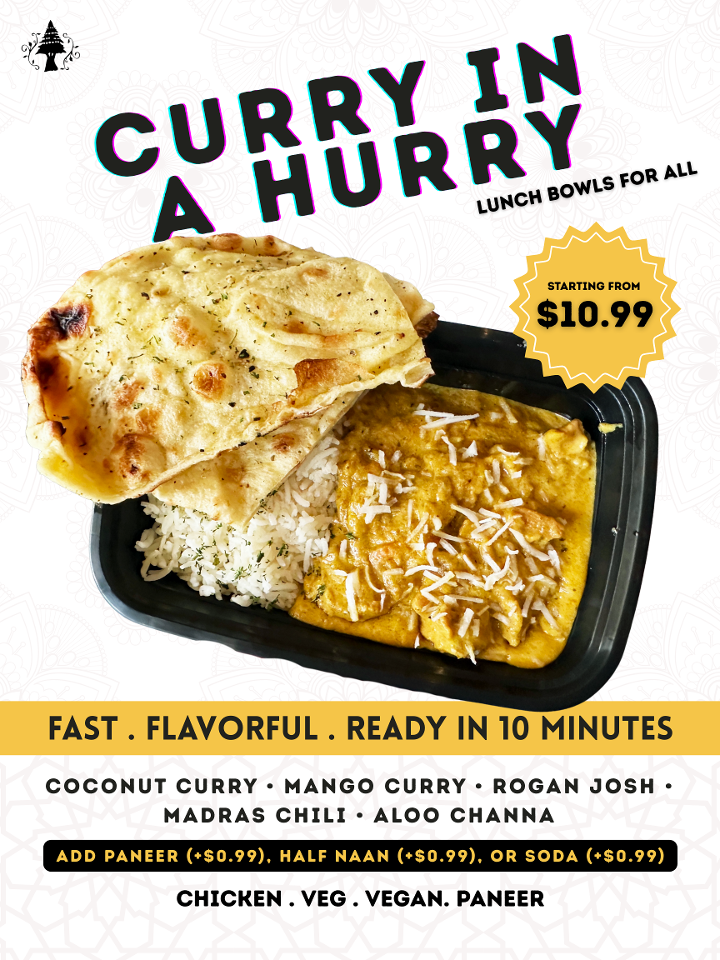 A quick, satisfying vegetarian curry bowl served with fragrant basmati rice. Choose from Coconut Curry, Mango Curry, Madras Chili, Rogan Josh, or Aloo Channa. Customize it your way with paneer (+$0.99), half naan (+$0.99), or a chilled soda (+$0.99).