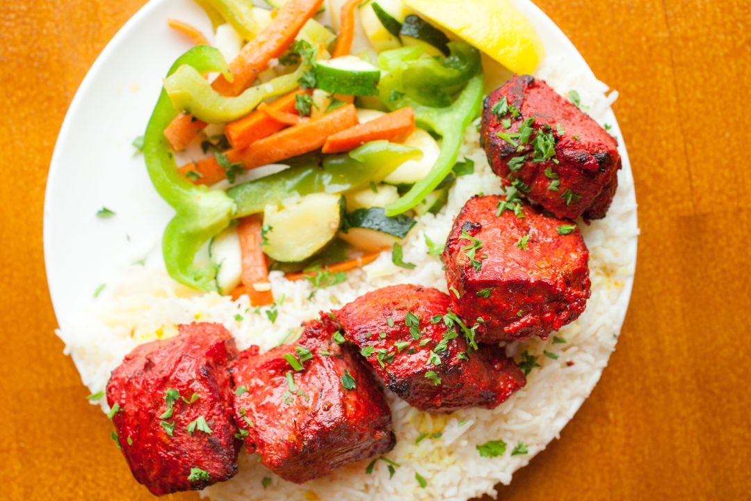 Boneless chicken marinated in yogurt, herbs, and spices. Served on a bed of lettuce with cilantro and tamarind chutneys.